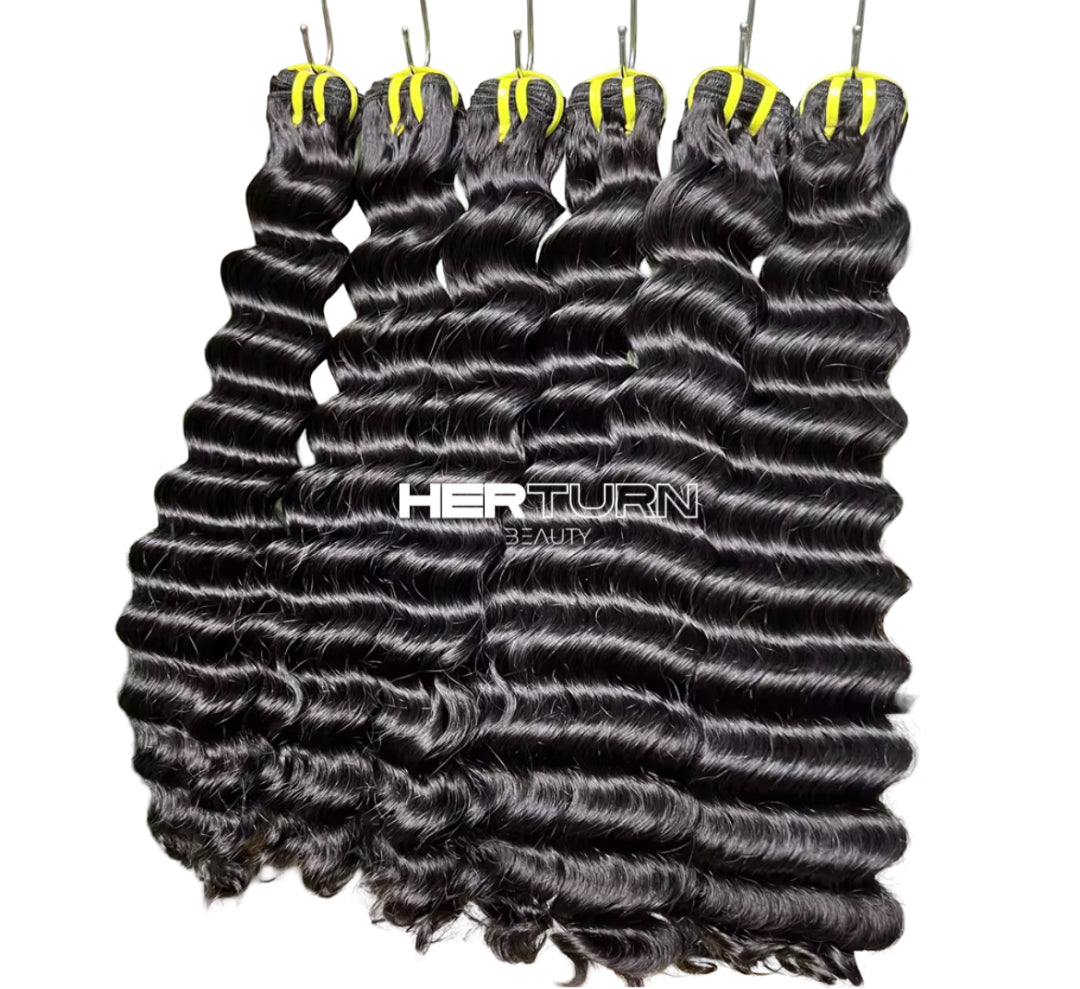 Our Rich Wave bundles (deep wave texture) deliver deep, luxurious curls that make a statement. Made from 100% virgin human hair, this texture is full of volume, body, and richness—perfect for the beauty who wants to turn heads with every step.